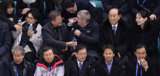 ムン・ジェイン大統領は金永南常任委員長と金与正あたり宣伝扇動部第1副部長が座っている方にミネラルウォーターを渡した。バッハ委員長は、裏側から水を受けたように見えた。