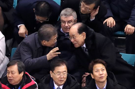 金永南常任委員長がムン・ジェイン大統領を見つめながら何か言葉をかける場面があった。金与正部長の視線もムン・ジェイン大統領を向けた。