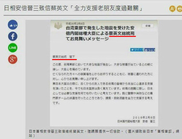 【拡散】安倍総理の台湾地震お見舞いメッセージから