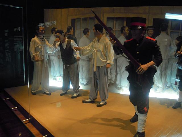 日露戦争後、日本は朝鮮(韓国)の外交権を奪い、韓国統監府をおき、さらに内政権も握って、軍隊を解散させました。解散させられた兵士は、農民とともに日本に抵抗(義兵運動)し、初代韓国統監府だった伊藤博文が民族独立運動家の安重根に射殺される事件も起こりました。このような動きに対して、日本は、1910年、軍隊の力を背景にして朝鮮を植民地化しました。これを韓国併合と言います。>>105