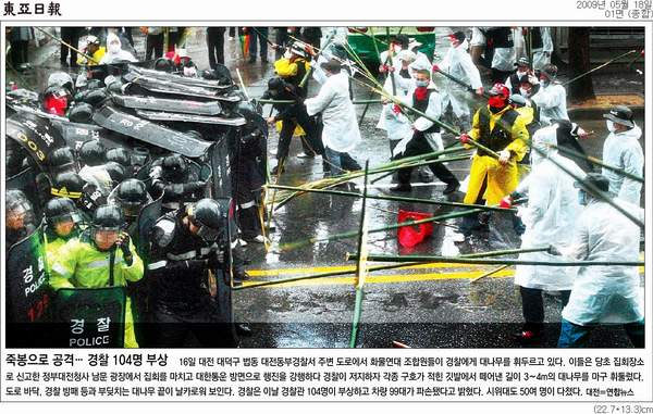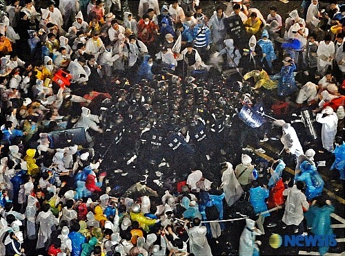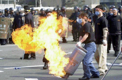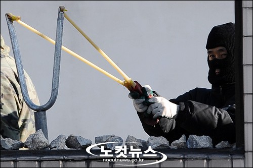 따라서 무력시위를 수행할 경우 자동적으로 지휘부와 무력부가 나뉘어진다. 제식훈련을 받았기 때문에 오와 열이 나뉘어 일사불란하다韓国のデモって、北朝鮮の工作が混じってんだろw