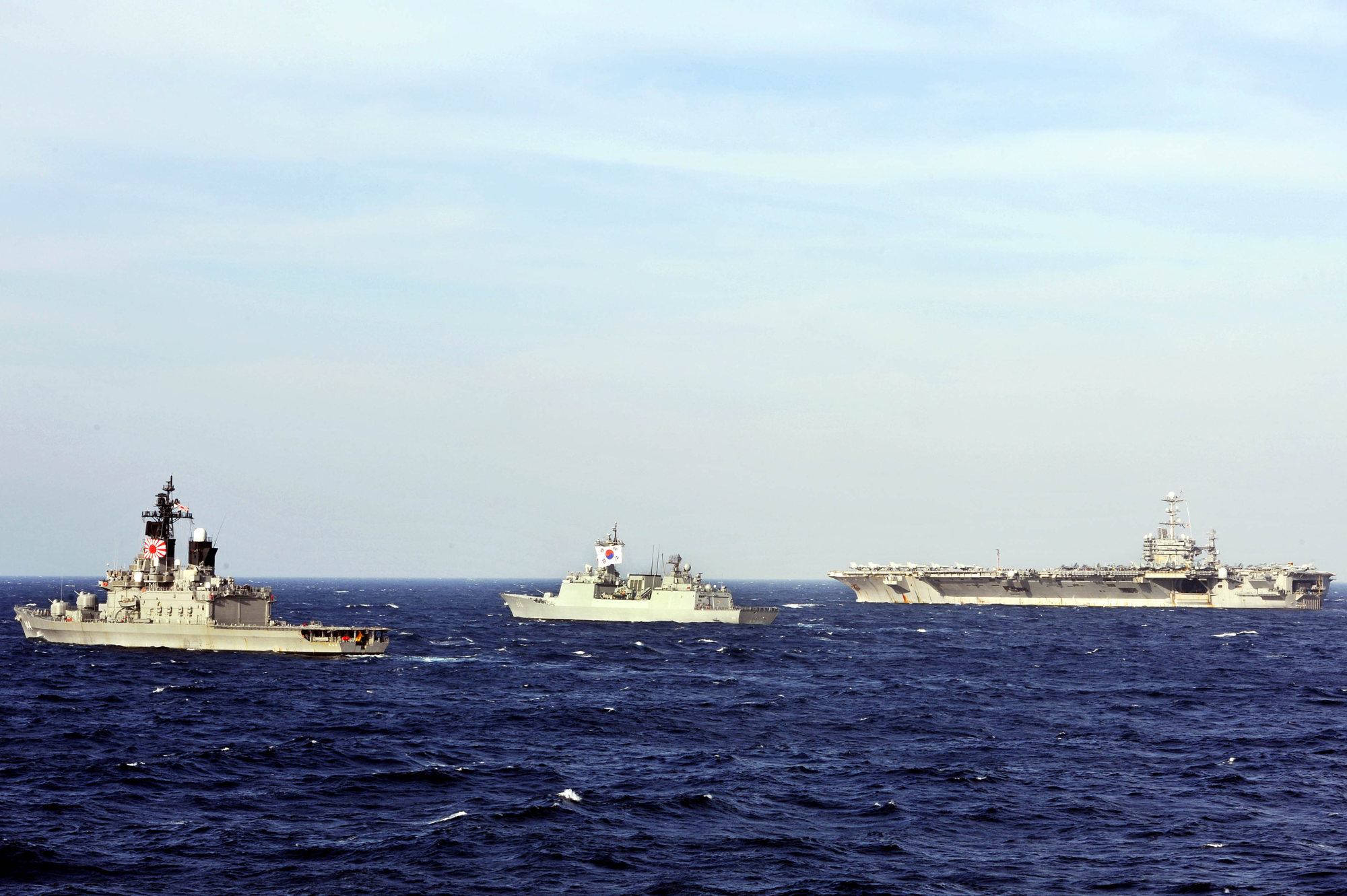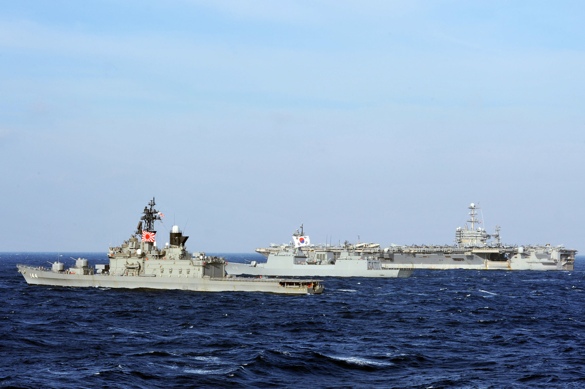 韓国海軍と日本の海上自衛隊と一緒に合同訓練をしていた。