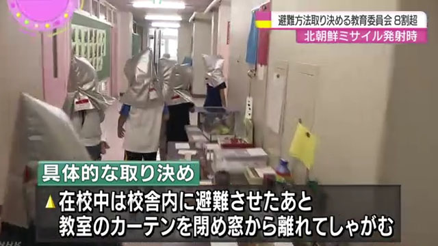 日NHK는 “문부과학성 조사에 따르면, 전국 도도부현 교육위원회의 85.1%, 시구정촌 교육위원회의 66.6%가 학교에서 학생들에게 (북한 탄도미사일 공격 시) 대피 요령을 가르치는 것에 동의했다”면서 “이 가운데는 학생과 보호자들이 불필요하게 불안해하지 않도록 학교장이 직접 해당 훈련에 대한 설명회를 가진 학교도 있었다”고 전했다.