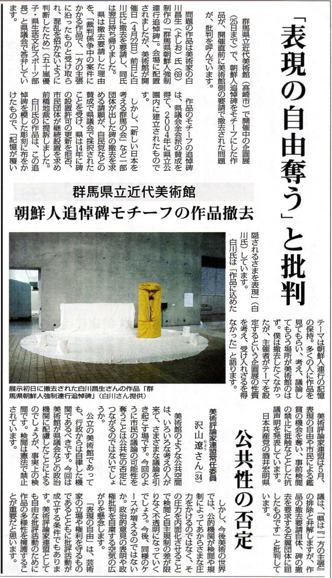 14일 교도통신에 따르면 마에바시 지방법원은 군마현이 2014년 다카사키시 소재 현립공원에 있는 조선인 강제연행 희생자 추도비의 설치 기간 갱신을 불허한 처분은 위법이라며 처분 취소 판결을 내렸습니다.