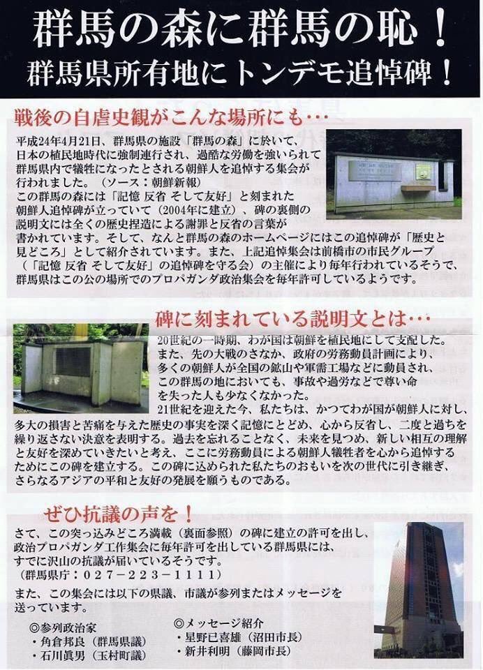 추도비를 관리하는 '조선인 추도비를 지키는 모임'은 당시 군마현이 추도비 설치허가 갱신을 불허하자 헌법이 규정한 표현의 자유에 반하는 것이라며 갱신불허 처분 취소를 요구하는 소송을 제기했습니다.