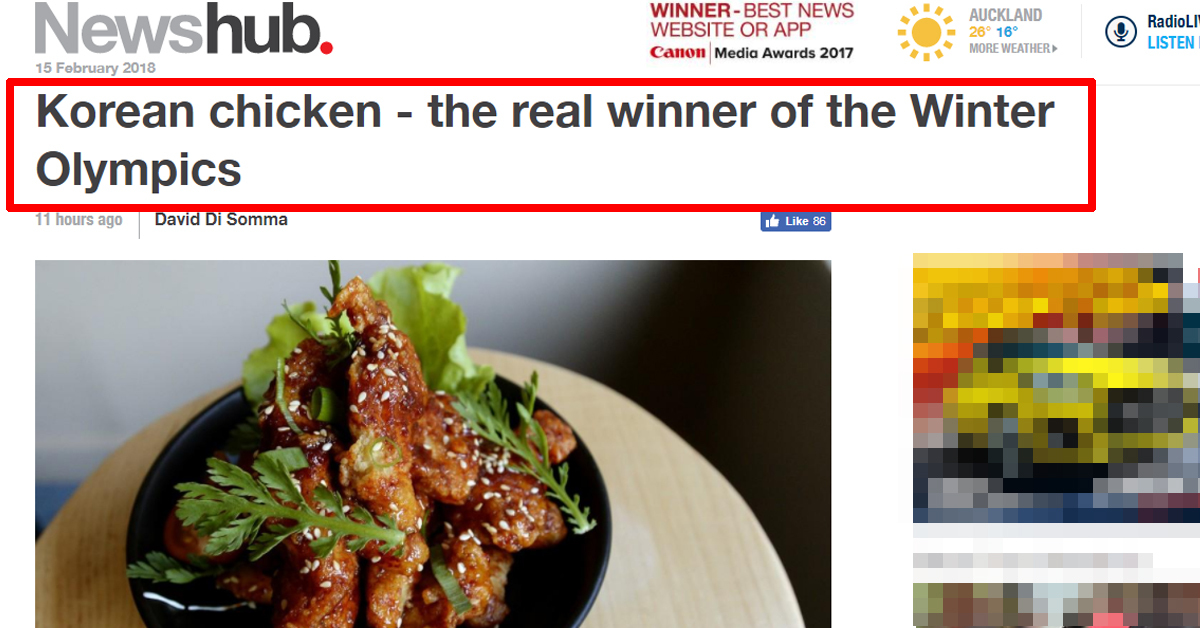 평창 올림픽을 취재 중인 뉴질랜드 기자가 “평창 올림픽의 진정한 우승자는 한국 프라이드치킨”이라며 극찬했다.