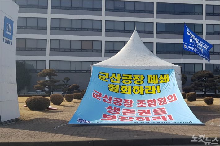 不思議なことに、このテントは閉鎖が決定した群山工場ではなく、継続が検討されている富平工場に出現した。今回このテントを設営したキム群山工場労組委員長は「労組は今までも会社経営に協力してきた。工場閉鎖に至った原因は経営者側にある。公的支援への世論の風が厳しいのはGMの説明不足で、労組は被害者だ」として工場撤退が撤回されるその日まで無期限でテント生活を継続していくことを誓った。