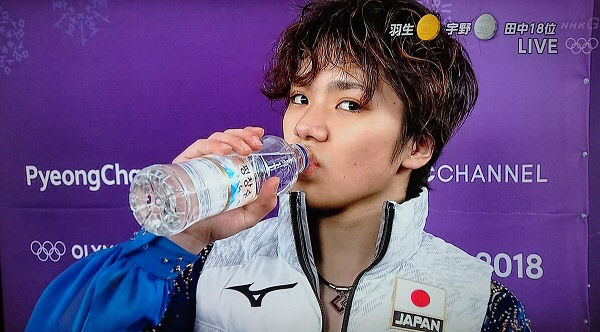 NHKのインタビューに答える宇野昌磨選手にNHKのスタッフがペットを差し出し、宇野がゴクリとその水を飲む。