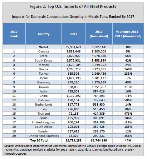 米国が鉄鋼を多く輸出している国の中で、カナダ、日本、ドイツなど米国の伝統的な友邦は12カ国に含まれていなかった。