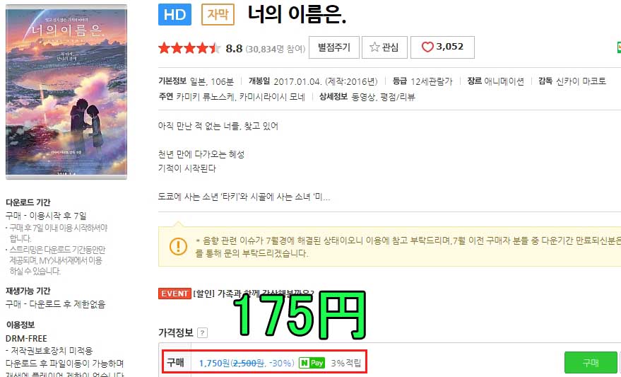 한국 인터넷에서 '175 엔'에 판매되고 있다.