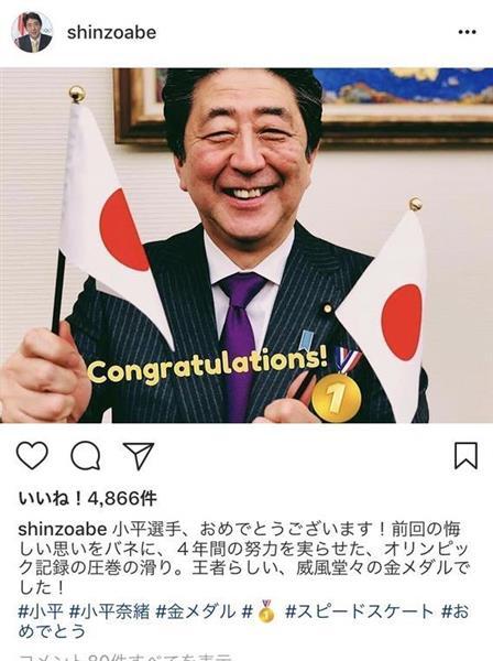 安倍晋三首相は18日、平昌五輪スピードスケート女子500メートルで小平奈緒選手が日本女子初の金メダルを獲得したことを受け、インターネット交流サイト(SNS)のインスタグラムなどに祝福のコメントを寄せた。首相は「前回の悔しい思いをバネに、4年間の努力を実らせたオリンピック記録の圧巻の滑り。王者らしい、威風堂々の金メダルでした」と称賛した。