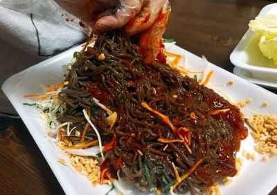 9푸른하늘2018/02/22(Thu) 23:29:56ID:c4NDYxNTg(2/23)NG報告>>7막국수의 먹는 방법은 - 국수와 양념과 야채가 별도 준비된 상태에서- 비닐 장갑을 장착하고 - 식탁에서 섞는 것이다. - 양념과 야채와 면의 혼합이 완료되면 젓가락으로 먹는다. 작성하고 보니, 일본인 정서에는 적절하지 않은 음식 같다.3