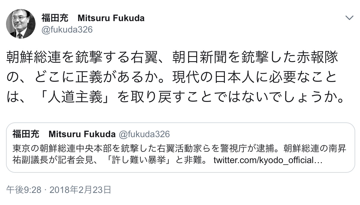 日本大学危機管理学部教授、Mitsuru Fukudaさんはツイで左翼?について怒ってるようだけど…。
