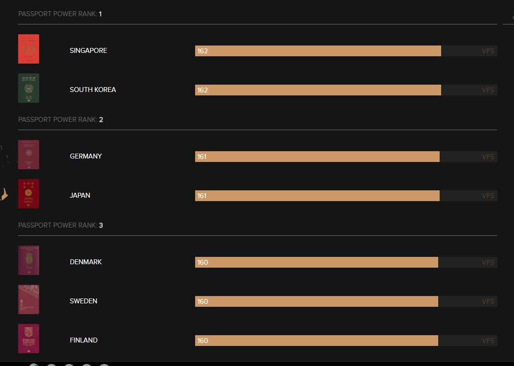 3位は韓国、デンマーク、フィンランド、フランス、イタリア、スペイン、スウェーデンが並んだ。ビザなしで渡航できる国は178カ国。