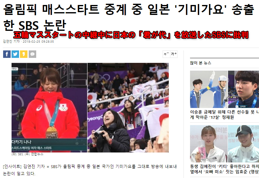 テレビ局SBSがメダル授与式で「君が代」を流したことにより批判殺到 「君が代は戦犯国歌だ、歌うのを強要された」
