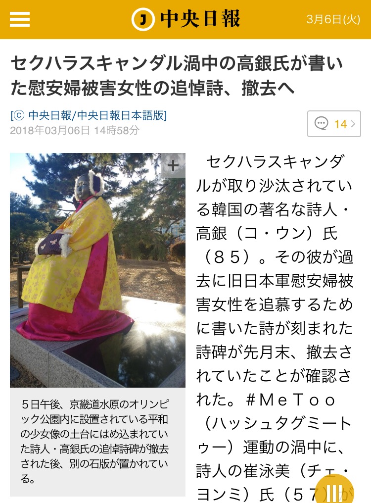 ソンチュムンに包まれたコ・ウン詩人(85)の沈黙が続く中、わずか10年前にも、彼は公開的な席で性暴行を続けたが、具体的な証言が出ている。チェ・ヨンミ詩人(57)の初暴露直後と詩人は、「30年前のことである。奨励次元で手首を捕まえたが、悪い意図はなかった」と語った。しかし、複数の文学界の挨拶によると、高詩人のセクハラは長い期間続いた。