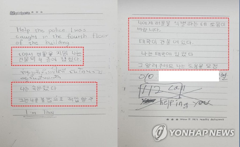 このメモには生半可な韓国語と英語、タイ語で「4階に捕われているタイ人だ。 助けてほしい」の内容が書かれていた。