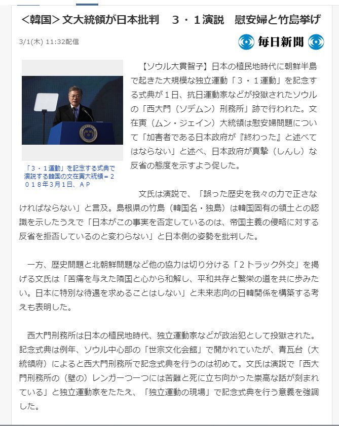 島根県の竹島(韓国名・独島)は韓国固有の領土との認識を示したうえで「日本がこの事実を否定しているのは、帝国主義の侵略に対する反省を拒否しているのと変わらない」と日本側の姿勢を批判した。