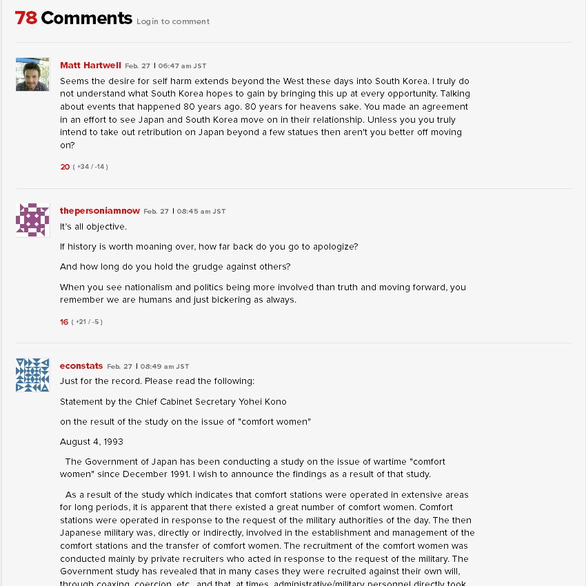■この馬鹿げた問題に病的なまでに執着する韓国はおかしいよ。あれは戦争だった。男は命を奪われたが、彼女たちは無事だった。そう考えると、率直に言っちゃうと、かなり小さな問題なんだよね。それに国に謝罪を求めるのも滑稽だと思うんだ。謝罪が出来るのは人だけ、さらに言うと当事者だけなんだから。他人がやった事を、誰かが代表して謝るなんてはっきり言って無意味。だから前世紀のことを今の政治家に謝罪させるなんて、どうかしてるぜってくらい可笑しなことなんだよ。 +9これのポイントは、ソース元が本来反日傾向の強いJT(Japan Times と Japan Today)という所。