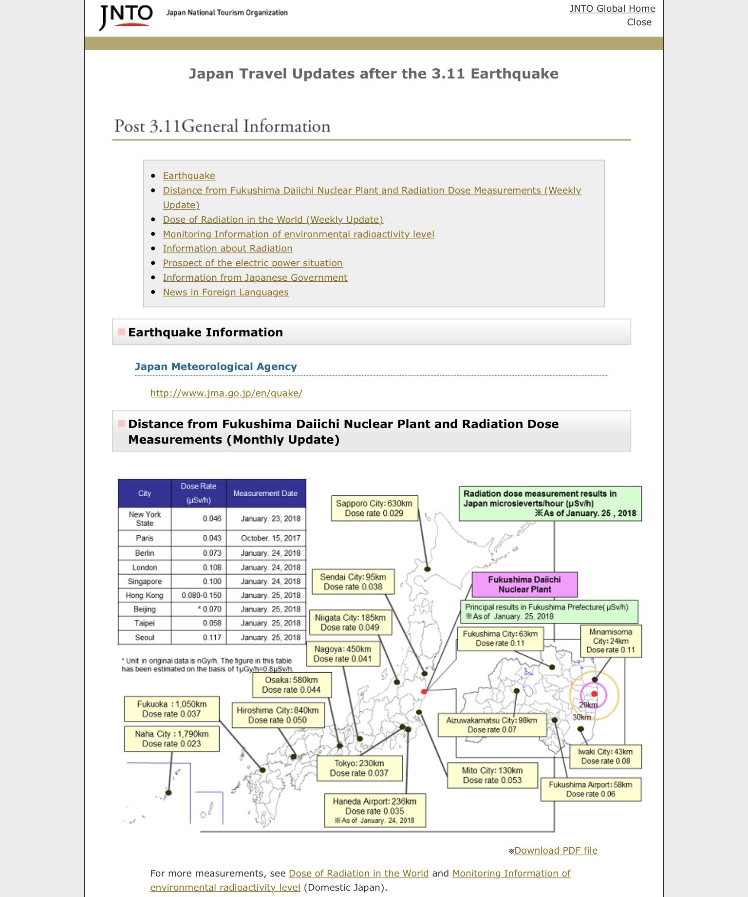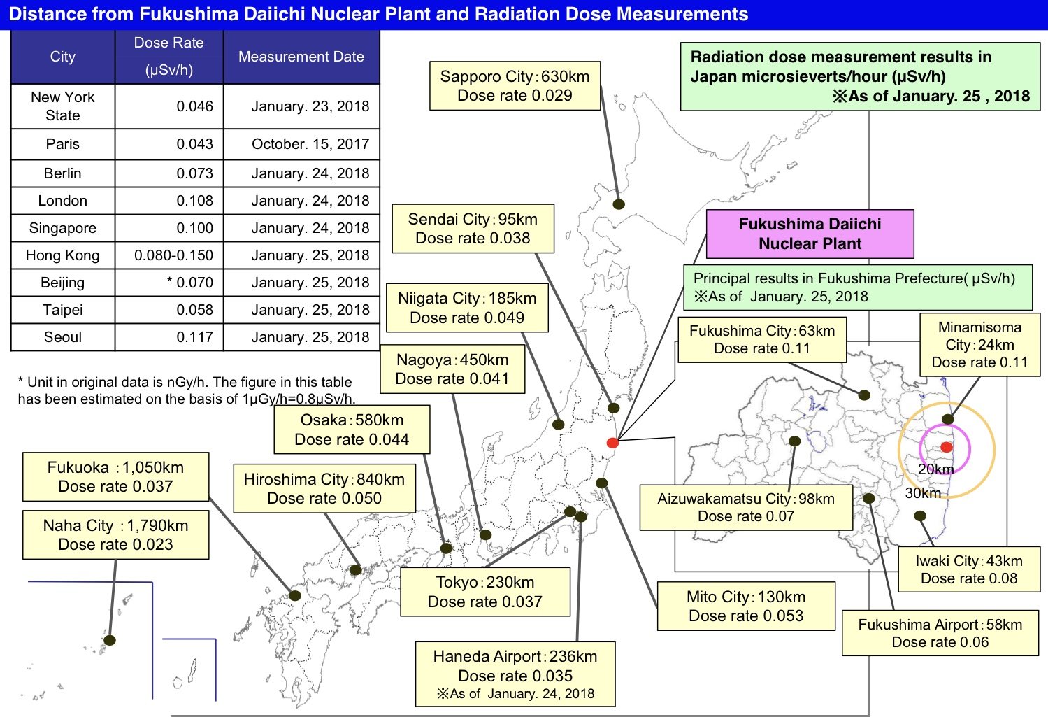 후쿠시마 원전에서 서북서 방향으로 20km 떨어진 나미에 지역의 오보리 마을에서는 시간당 11.6μSv(마이크로시버트)에 이르는 방사선량률이 측정되기도 했다. 이는 연간 피폭량 101mSv에 해당해, 피폭 한계치의 100배를 넘는 것이다.