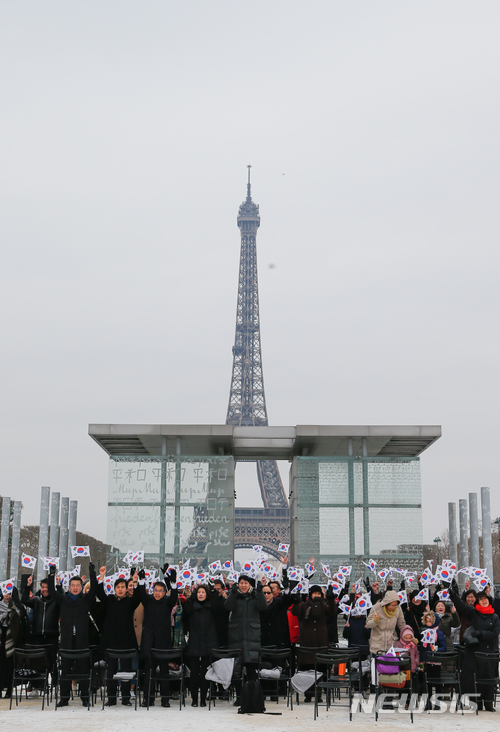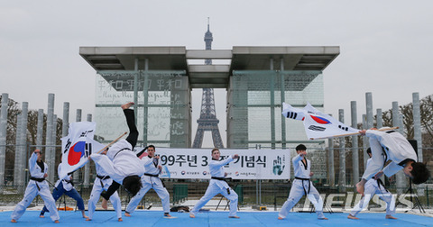 【パリ(フランス)=ニューシス】1日(現地時間)、フランス・パリのエッフェル塔平和の壁の前で第99周年3.1節の行事が開かれ参加した同胞たちが万歳三唱をしている。