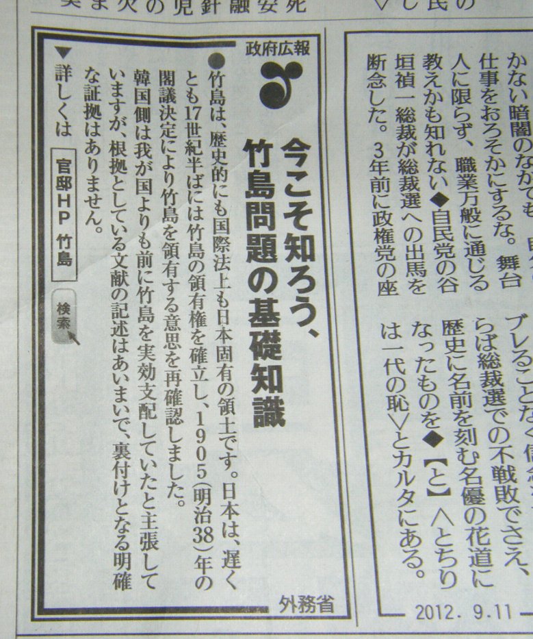 一方で日本では淡々と「我が国の領土」と言う立場でいる。やっても教科書に日本の主張を載せたり、竹島の日と作ったりする程度。