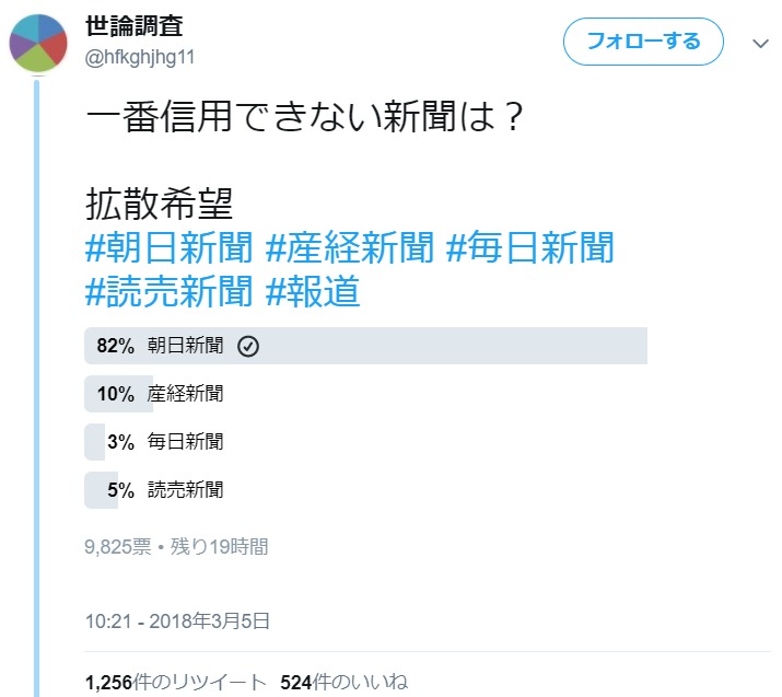 朝日新聞は、これらが得意技。だいたい「朝日新聞ですが、世論調査にご協力いただけますか」と言われて協力している時点で、朝日に拒否感がない人だから、もうバイアスがかかっている。俺だったら協力しねえし。産経は左側や朝鮮人が必死に投票した結果だろう