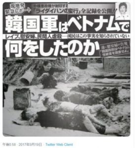 こんな最低の行為を「勝利」と誇る朝鮮人の本性は正に唾棄されるべきモノだ、そしてそれが遺憾なく発揮されたのが外貨欲しさに参戦したベトナム戦争であり、その責任に付いては一切知らん顔で妄想の被害で日本に金を集る、地上最悪の人種だと思う。