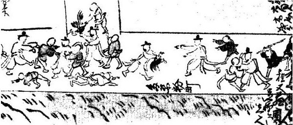 1748年の朝鮮通信使を描いた『朝鮮聘礼使淀城着来図』。鶏を盗んだ朝鮮人が土地の住民たちに追いかけられている様子が窺える。