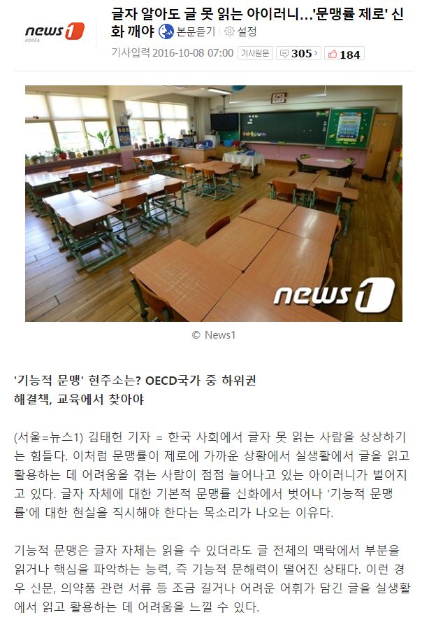 글자 알아도 글 못 읽는 아이러니…'문맹률 제로' 신화 깨야 기사입력 2016-10-08