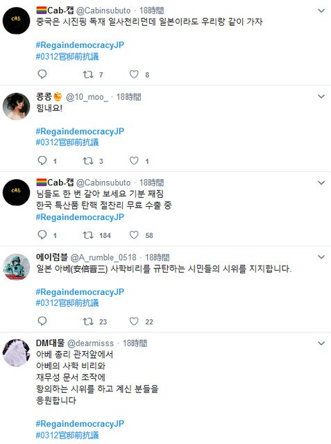 ハッシュタグは「#RegaindemocracyJP」。韓国では森友問題は、政権トップが国政を動員して自分の周辺者を支援し、甘い汁を吸わせた朴前大統領の犯罪と構図がそっくりだとの声が上がっている。