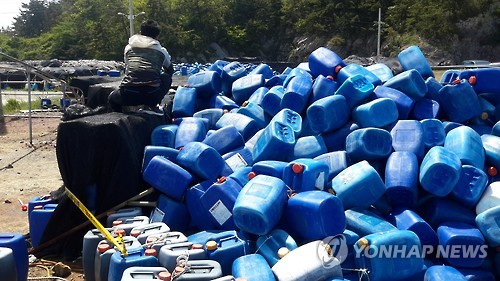 ポリタンクの多くにハングルの表記があり、中には強い酸性の液体が残っているものもあったという。