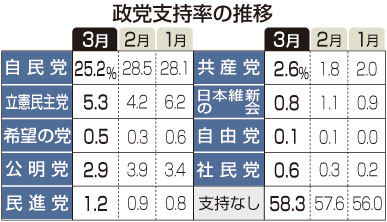 時事通信が9~12日に実施した3月の世論調査で、政党支持率は、自民党が3.3ポイント減の25.2%、立憲民主党は1.1ポイント増の5.3%。公明党2.9%、共産党2.6%、民進党1.2%、社民党0.6%、希望の党0.5%などとなった。支持政党なしは58.3%だった。