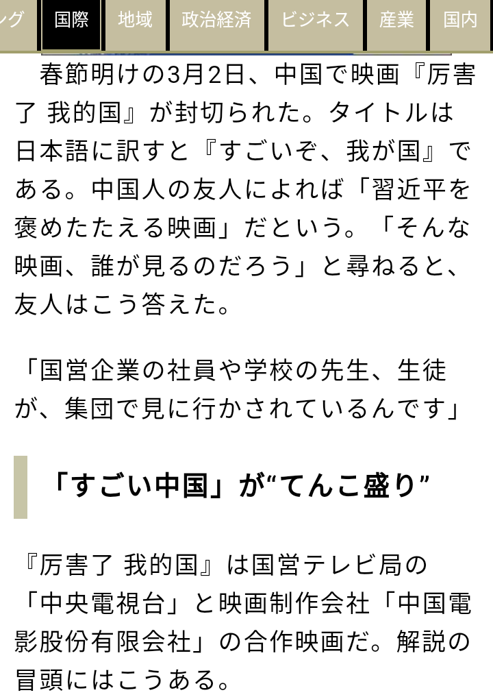 春節明けの3月2日、中国で映画『厉害了 我的国』が封切られた。タイトルは日本語に訳すと『すごいぞ、我が国』である。中国人の友人によれば「習近平を褒めたたえる映画」だという。「そんな映画、誰が見るのだろう」と尋ねると、友人はこう答えた。