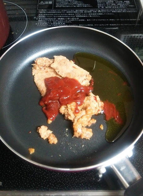 ソースが肉に吸収されて無くなったからケチャップとオリーブオイルを大さじ1づつ追加