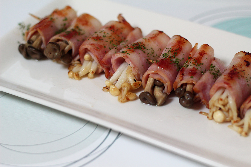 ベーコンまたはソーセージとしめじを炒めて