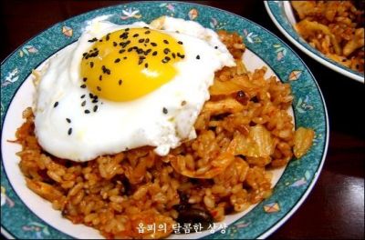 냉장고에서 김치와 밥 계란을 꺼내서 볶아 먹는다.