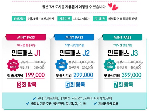 本来の料金は6万円、10万円、14万円だが、「Mint Pass」により大幅に割り引いている。また先着1000人に対して更に10万ウォン(約1万円)の割引を行う。