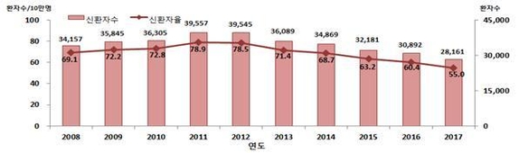 질병 관리 본부가 23 일 '제 8 회 결핵 예방의 날'을 맞아 발표 한 '2017 년 결핵 환자 신고 현황'에 따르면, 지난 한 해 동안 과거 결핵 치료를 한 적이없는 결핵 신규 환자 수는 2 만 8161 명 (10 만명당 55 명) 인 것으로 나타났다.