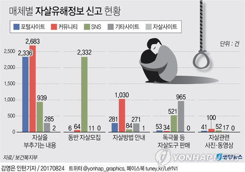 24日、保健福祉部によると、傘下の中央自殺予防センター自殺有害情報監視団」守って拡大(人)」と警察庁サイバー犯罪監視団」享受カーパンプス」は、7月12〜25日、インターネット上の自殺有害情報を集中的に発掘して1万2千108件を申告した。