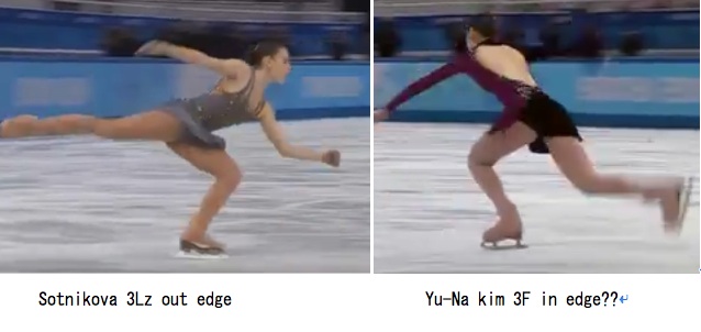 wrong edgeの話をするのなら、ソトニコワの3Lzは踏み切る直前まで深いout edgeである。写真のようにedgeが反射して光るのが、その証拠。