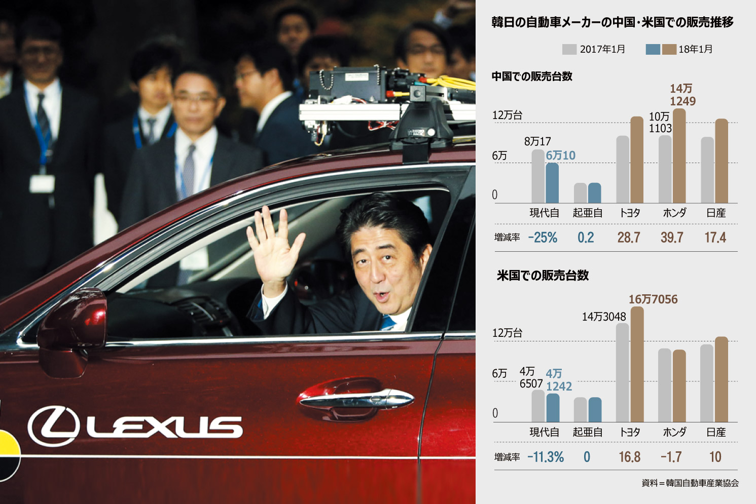 今年に入っても、現代・起亜自の米中市場での販売台数は減少している。1月の中国市場での販売台数は9万162台で、前年同月を18.1%下回った。米国での販売台数(7万6870台)は6.4%減少した。一方、トヨタ、ホンダ、日産など日本の自動車メーカーは中国で43万1064台を売り上げ、販売台数を前年同月より28%伸ばした。米国市場でも1月に販売台数を9.1%伸ばした。日本車の米国市場でのシェアは1年前の38.1%から41.2%に上昇。現代・起亜自のシェアは逆に7.2%から6.7%に低下した。