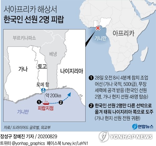 現地では3月26日、ガーナ人約40人と韓国人3人の船員が乗ったガーナ船籍の漁船「マリーン711(Marine 711)」号(総重量500トン)に、正体不明の海賊が乗り込んだ。海賊は韓国人を拉致し、別の高速船で逃走。現在も行方はつかめていない。