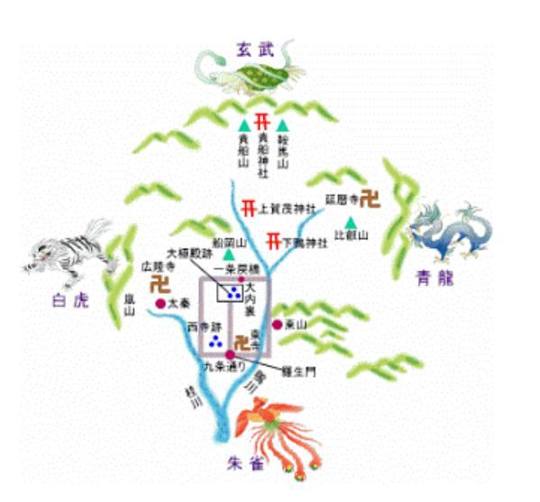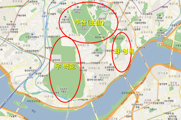 아래 사진은 서울의 지도....... 한국어 표기지만, 붉은 원 3개가 존재. 이것이 '좌측 청룡, 우측 백호, 북측 주산'으로