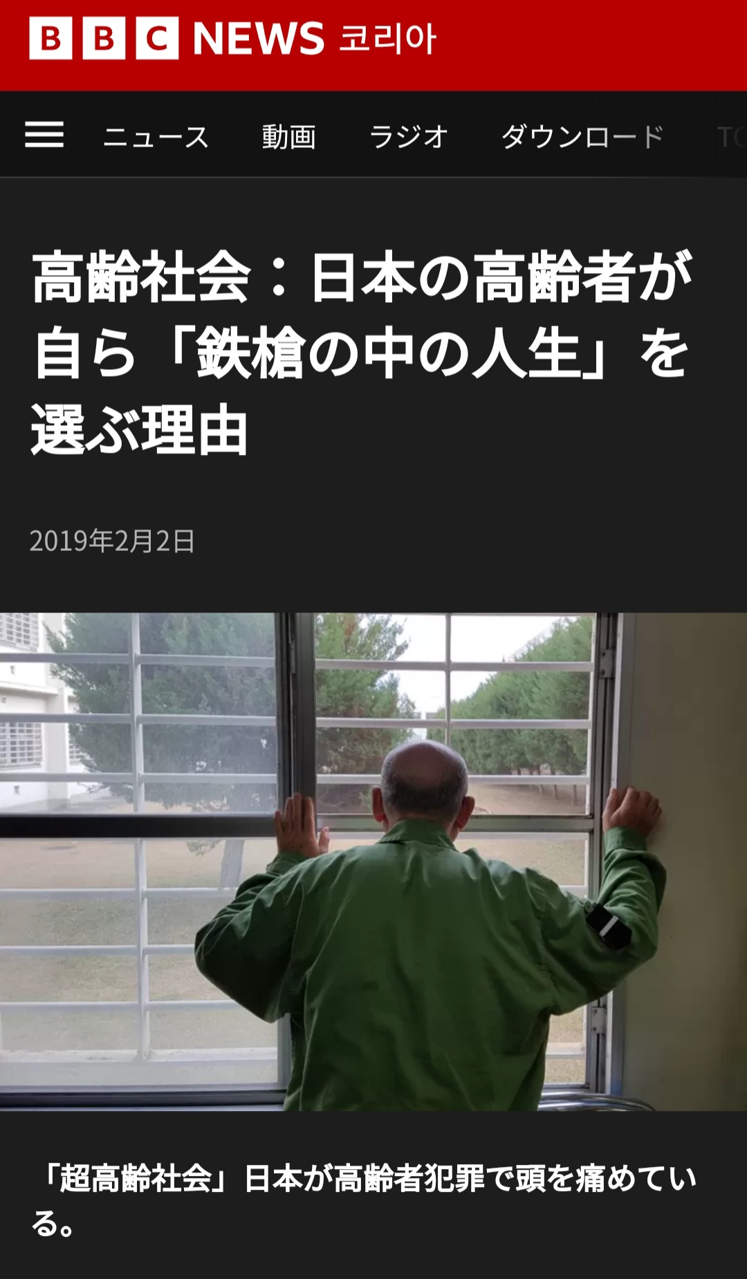 블룸버그는 "세계에서 가장 고령 인구가 많은 일본이 여태껏 보지 못했던 '노인 범죄'라는 문제를 겪고 있다"고 보도했다.