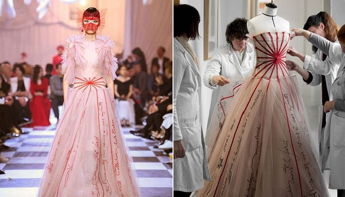 時代をリードしディオールの大胆ながらもアバンギャルドなデザインがファッションショーを圧倒した。今回のファッションショーに登場したドレスの中には戦犯起因日本の旭日基連想させるデザインが含まれていた。アイボリーカラーがベースであるドレスに赤いラインが真ん中に集まるデザインで一気に戦犯機連想させる。