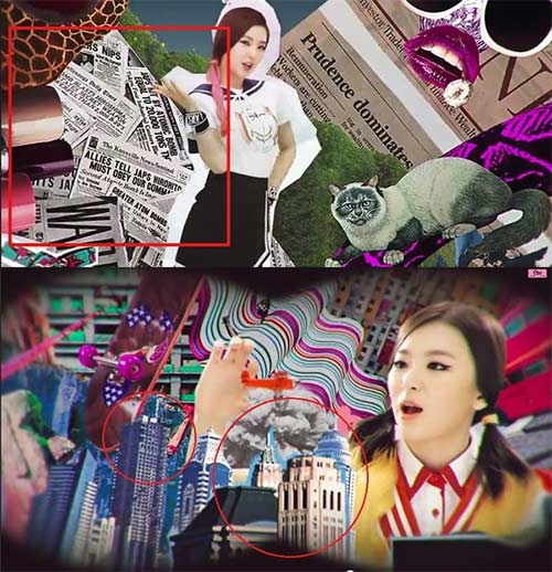 問題のPVでは英字新聞のコラージュが登場する際「JAPS HIROHITO」との昭和天皇への言及や「JAPS HIT BY ATOMIC BOMB」と広島の原爆投下に関する見出しなど日本に関する紙面ばかりを使用。さらに別の場面では世界貿易センタービルに飛行機が突っ込んでいる画像を使用した「9・11」を思わせる演出があったことで、日本のファンを中心に批判を呼んでいた。
