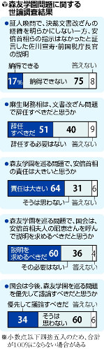 読売新聞社の全国世論調査で、学校法人「森友学園」を巡る決裁文書改ざん問題に対する国民の不信感が鮮明になった。