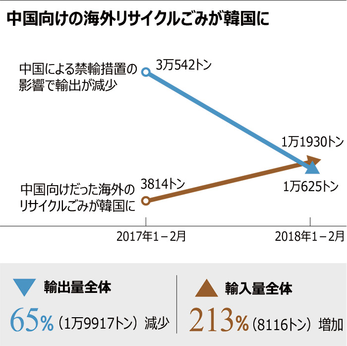 韓国環境部(省に相当)が3日に公表した資料によると、今年1-2月における韓国の廃プラスチック輸入量は1万1930トンで、昨年の同じ時期(3814トン)に比べ8116トン(213%)も急激に増加していた。これに対して輸出は昨年の3万542トンから今年は1万625トンと3分の1に急減した。