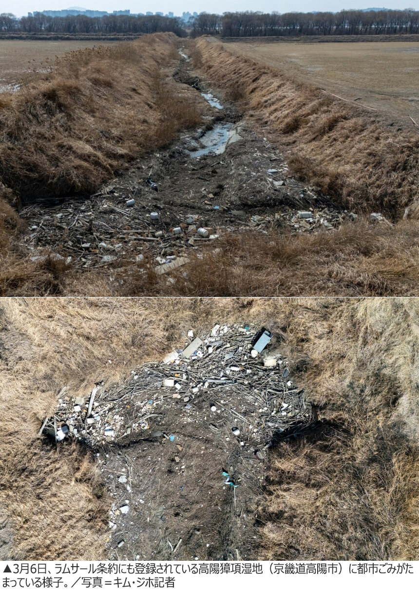 3月1日午後、京畿道高陽市の漢江河口部にある「獐項湿地」。湿地に生息する動植物を記録した生態館を通り過ぎ、保護区域へと向かう入り口にやって来ると、そこはフェンスでふさがれていた。かつては訪れた人々に門戸を開いていた場所なのだが、2021年に地雷事故が発生した後は立ち入りが規制された。フェンスには「立ち入る者は地雷による事故発生の危険があり、注意が必要」と記されていた。本紙が3月6日にドローンを飛ばしてこの一帯を撮影してみたところ、漢江とつながっている水流は、プラスチックや発泡スチロール、木の枝などの浮遊物がぎっしり詰まってせき止められていた。漢江流域庁の関係者は「漢江河口に押し寄せる都市ごみが湿地にたまっているが、地雷の危険があるので管理できていない」と語った。